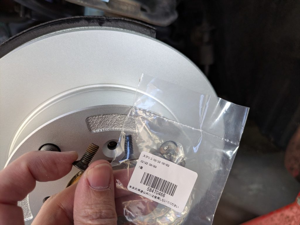 新品ローターをはめて皿ネジを締めます。仕上げにインパクトドライバーで軽く叩いておきました。この皿ネジも純正新品を買っておきました。