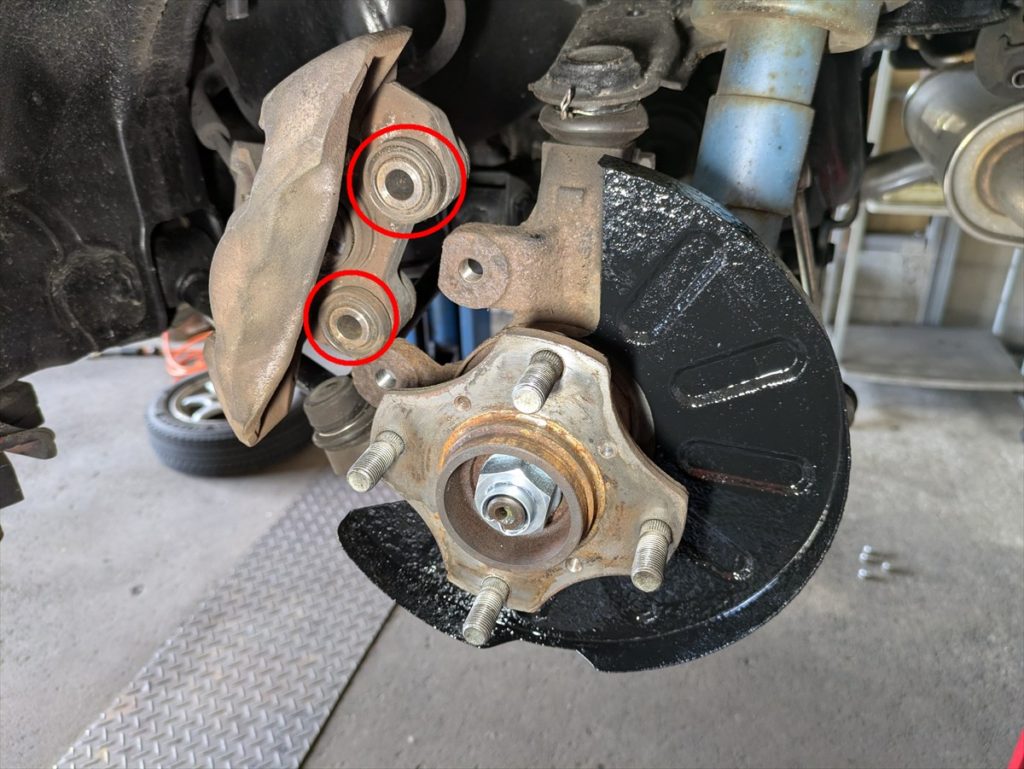 そしてキャリパーのスライドピンが固着していました。指で力いっぱい押すと動くようになりました。