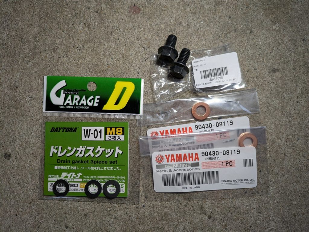 ガスケット(ワッシャー)はM8サイズで探すとデイトナのアルミ製(ドレンワッシャ M8 3枚入り)とヤマハ純正部品の銅製(90430-08119)が見つかりました。モノタロウで買ったのですが、アルミと銅どっちが良いかな~と両方カートに入れていて、全商品10%割引セールの終了が迫っていて気付かずに両方注文してしまいました…。