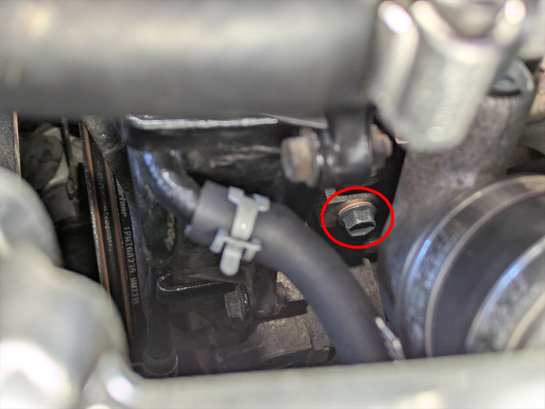 カプチーノはエキマニのスタッドボルトがエンジン内部に貫通しているので、コンプレッサーのアジャストステーのボルトも貫通していないだろうな??と疑念は持っていましたが、まさかまさか、ボルトに薄っすらエンジンオイルらしきものが滴っているではありませんか。ここのステーのボルトもエンジン内部に貫通しているようです。でも元々ワッシャータイプのガスケットがついている訳でもなく、ボルトにシール剤がついている訳でもなさそうなので、普通にボルトを締めていればそうそう漏れることはないのでしょうか。と言いつつ外して保管していたアジャストステーをよく見てみると、エンジンに当たる面にオイルが付着していたので、微量ながら漏れるようです。