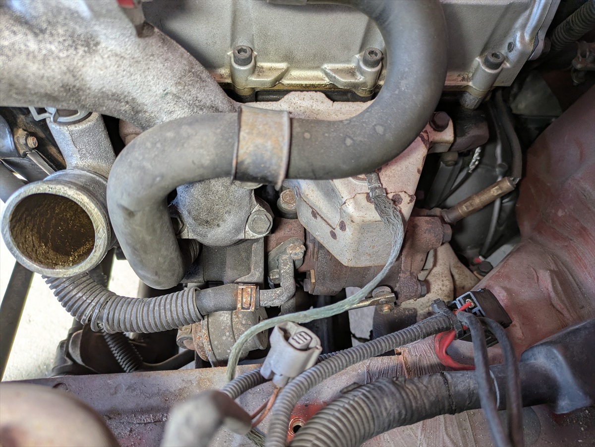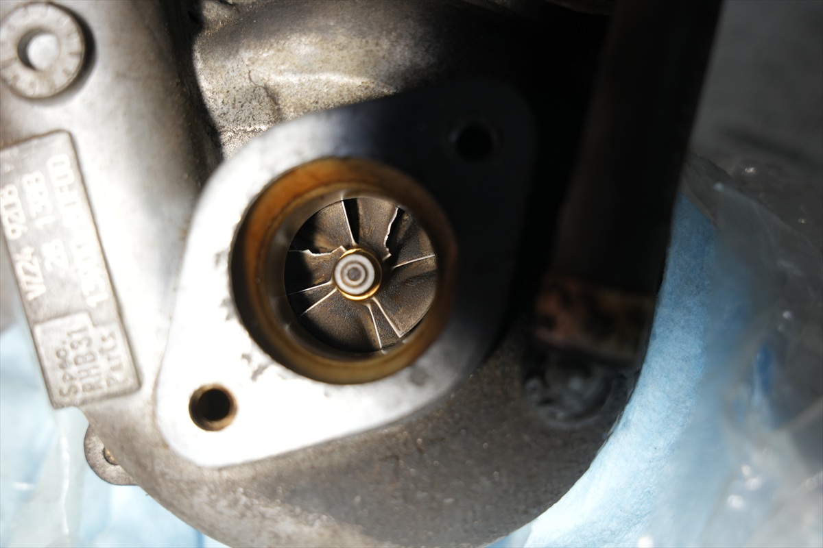 今回の現象ではブーストを掛けようとすると常にピーピーと大きな音(まさに笛吹音)が発生していて、発生源の特定は容易でした。停車状態で空ぶかしし、エンジンルームで耳を澄ますとタービンの真上が一番音が大きかったです。これはもうタービンだろうとあたりを付け、交換することを決意しました。タービンのシャフトにエンジンオイルがまわっていないのでしょうか…。実はこの点検の際に発生源を特定しようと空ぶかししまっくったのですが、その後運転していると突然音が無くなりブーストもかかるようになりました。直ったようにも感じますが、ブーストが掛かったときの音が不安定で近いうちに壊れそうな気配モリモリです。空ぶかししていたのでオイル通路の詰まりものが取れてオイルが流れるようになったのでしょうか???