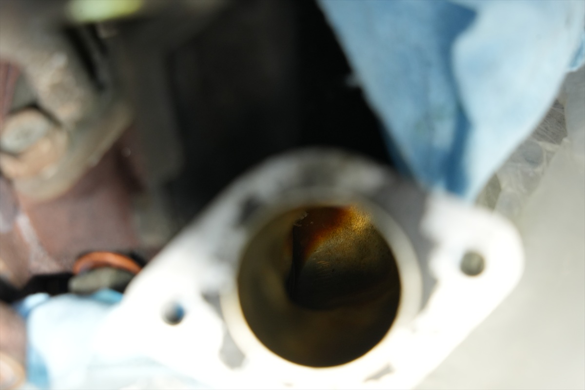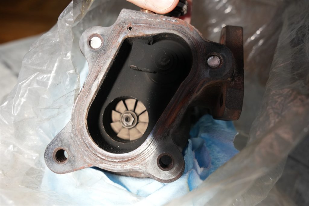 インテークパイプを外すと、タービンのコンプレッサーハウジングにエンジンオイルが溜まっていました。よく見ると冷却水も混ざっている(?)この車はエンジンオイルの消費がわりと激しく、半年に一回の割合で500㏄程度継ぎ足してきました。また、タービン以降のインテークパイプ内に多量のエンジンオイルが付着していました。エンジン内で燃えたというよりはタービンから漏れていたことが原因だったのかもしれません。今後エンジンオイルが減らなければタービンからの漏れが主な要因だったと言えそうです。