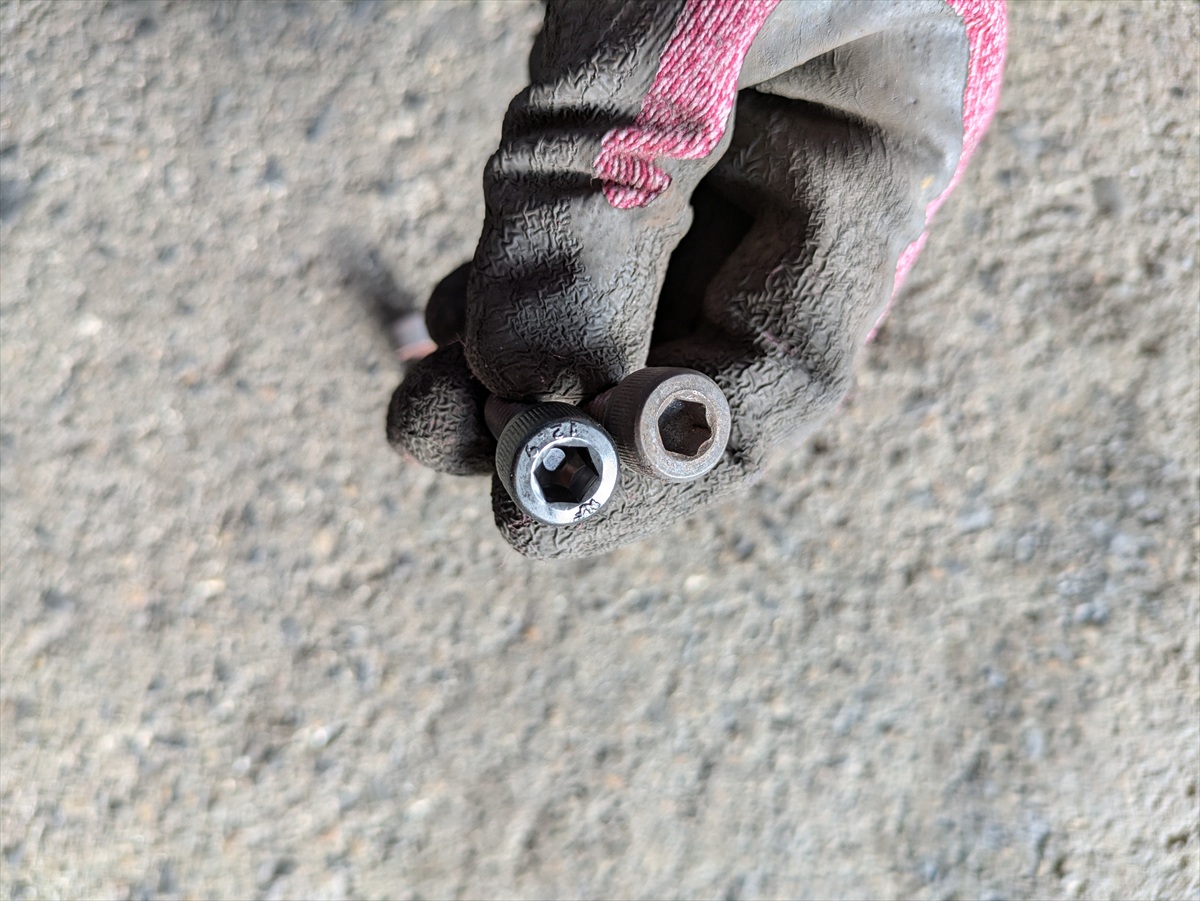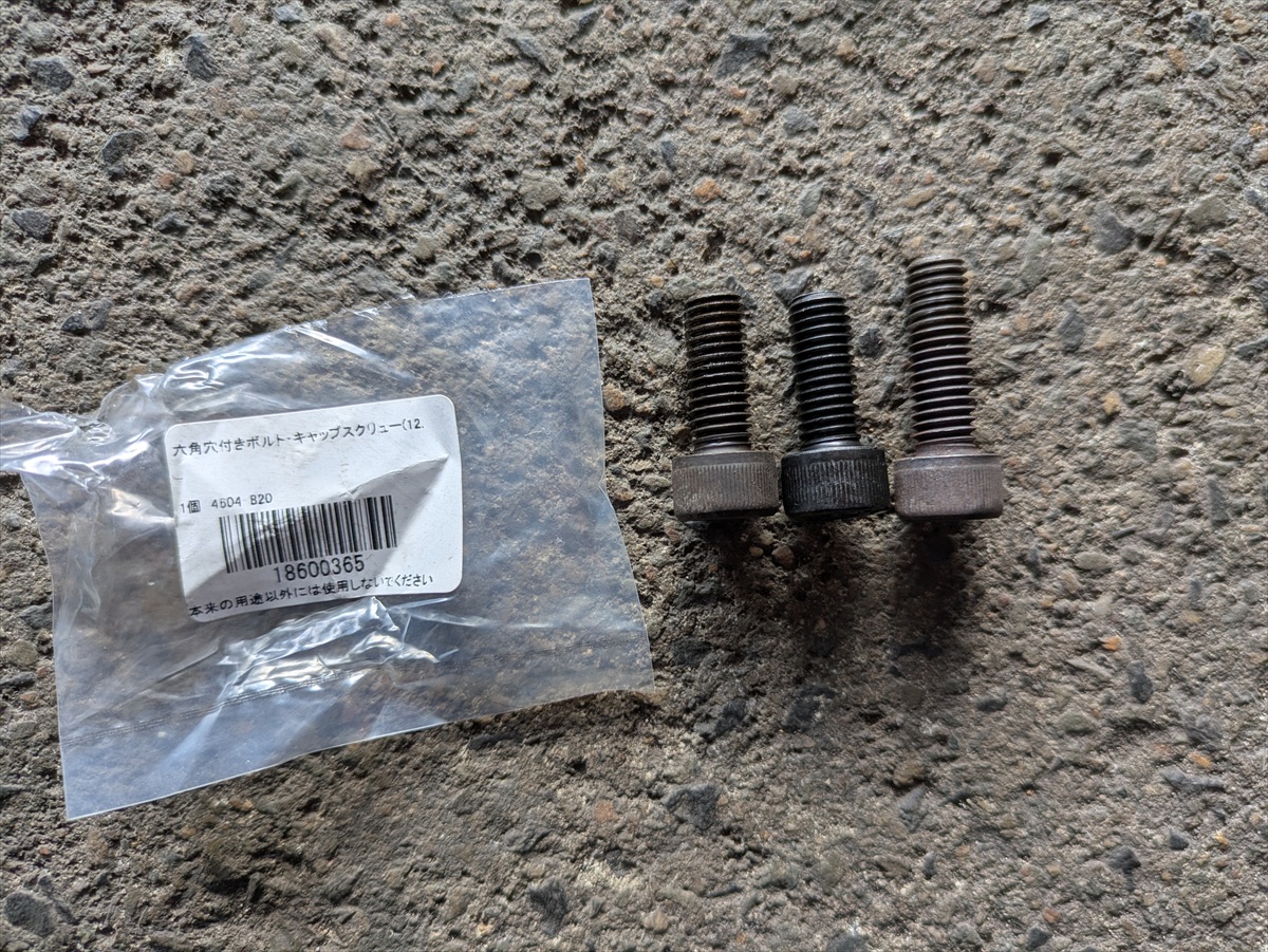 エキマニとエンジン間には六角穴付きボルトが2本使用されていますが、それぞれ長さが違い、車体後方に使うボルトの方が長く、シール剤も塗布されています(エンジン内部に貫通している模様)。で、この後方側の長くてシール剤が塗布されているボルトはまだ純正部品が出ますが、前方側の短い方は廃盤(?)のようです。長い方は純正新品を取りましたが、短い方もどんな状態か分からないのでモノタロウで汎用品を購入しておきました。サイズはM8×20です。高温になる部分なので汎用ボルトで良いんだろうかと思うところではありますが、ほかに手がないので物は試しです。一応「12.9T 焼入」の表記があるので強そうではあります(モノタロウ注文コード:18600365)。備忘録でモノタロウボルトをリンクしておきます↓。